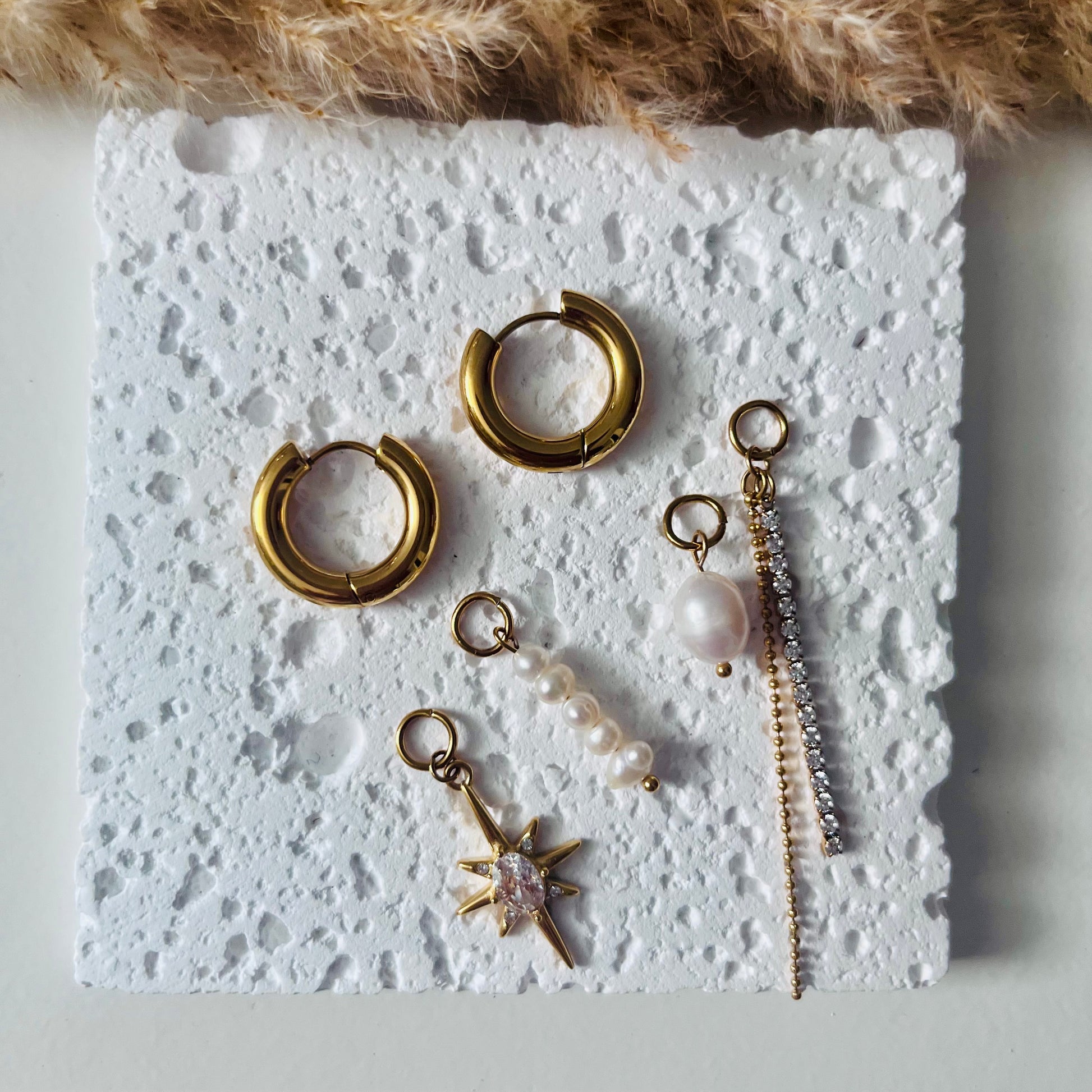 Su diseño asimétrico combina perlas, circonias y un charm de estrella brillante, creando un look versátil que puedes usar tanto en ocasiones especiales como en tu día a día.