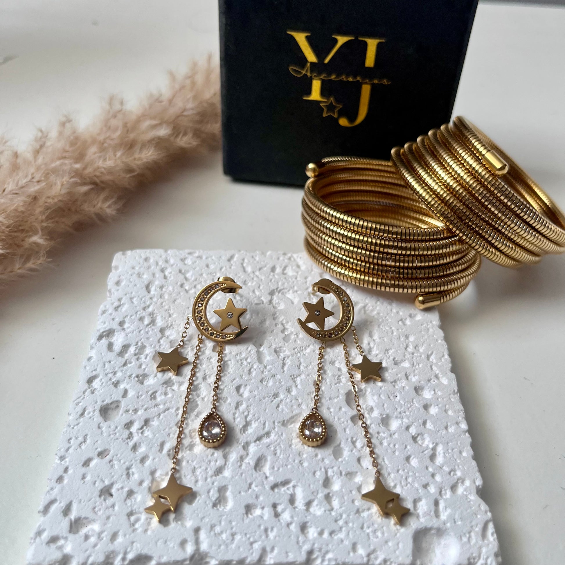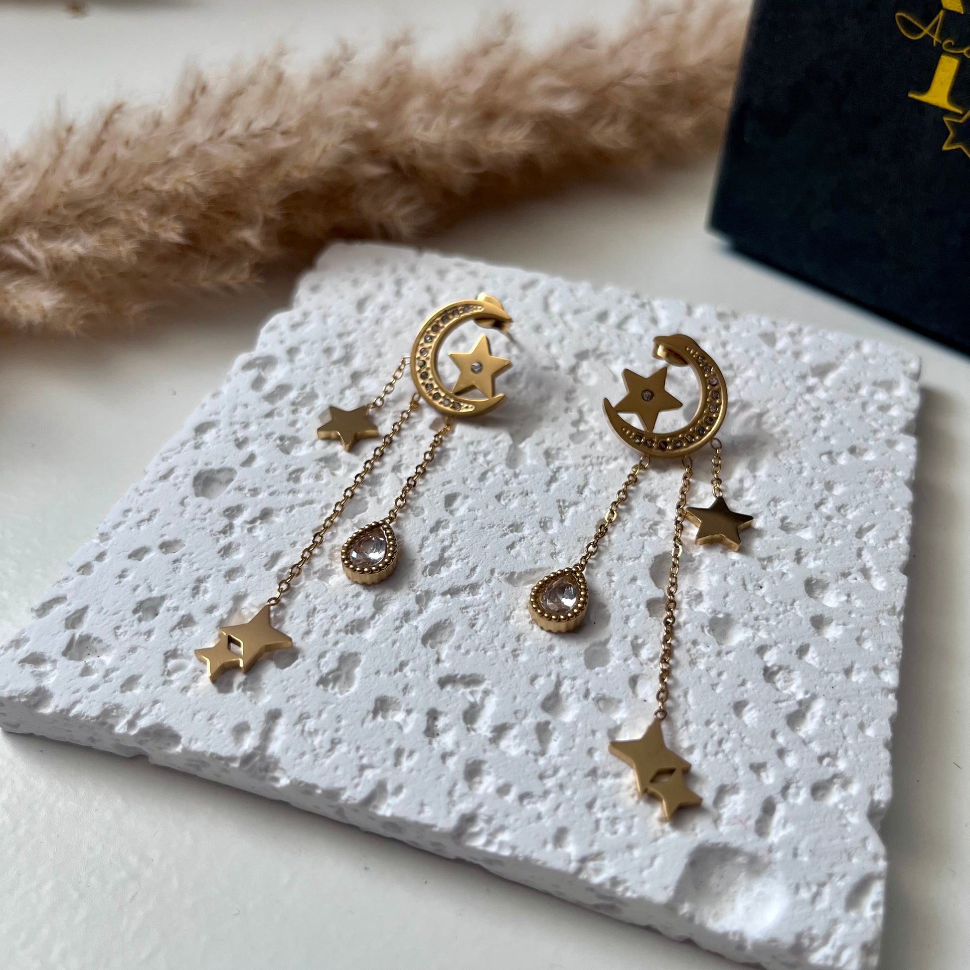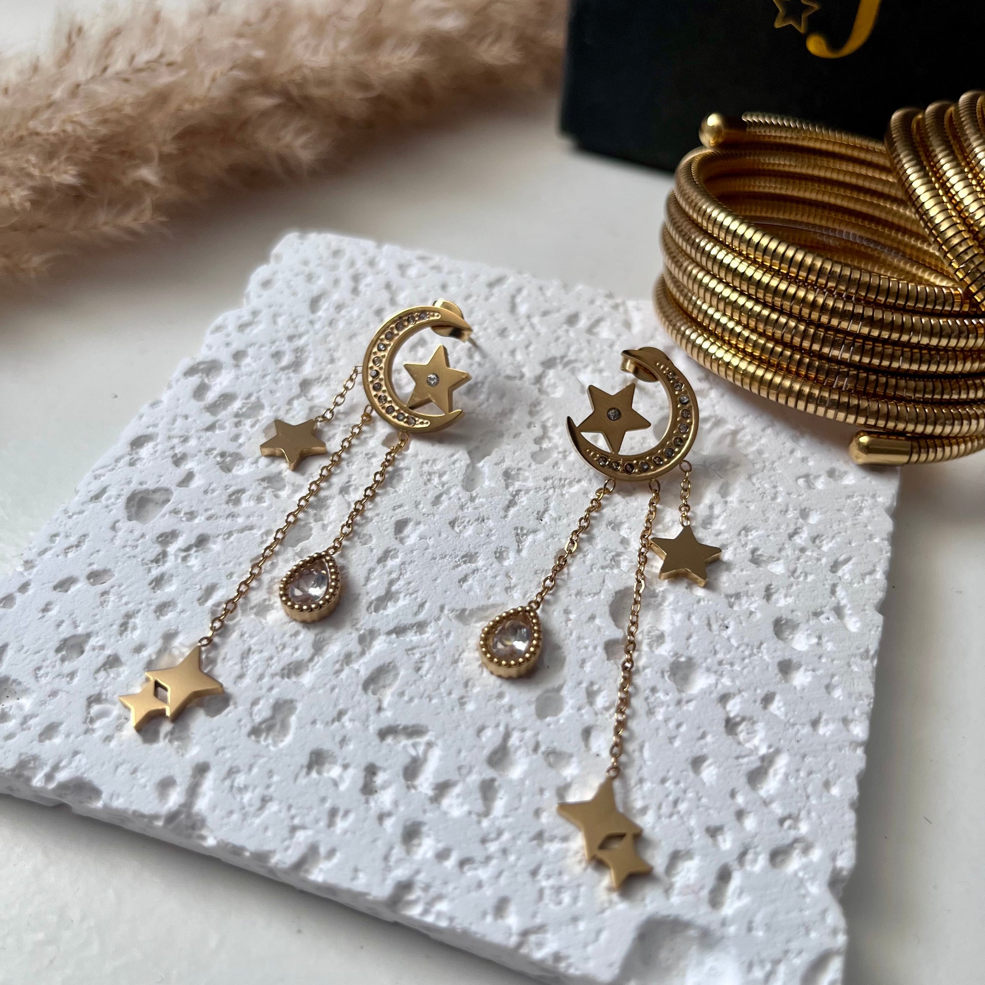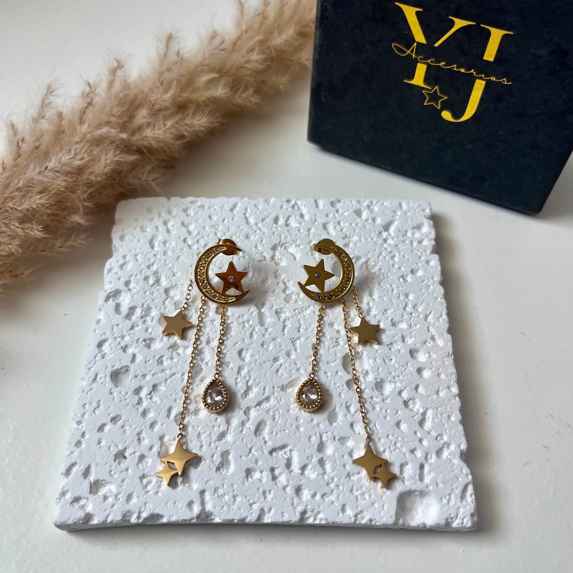 Los Aretes Luna y Estrellas capturan la magia del cielo nocturno con su diseño colgante lleno de movimiento y luz.