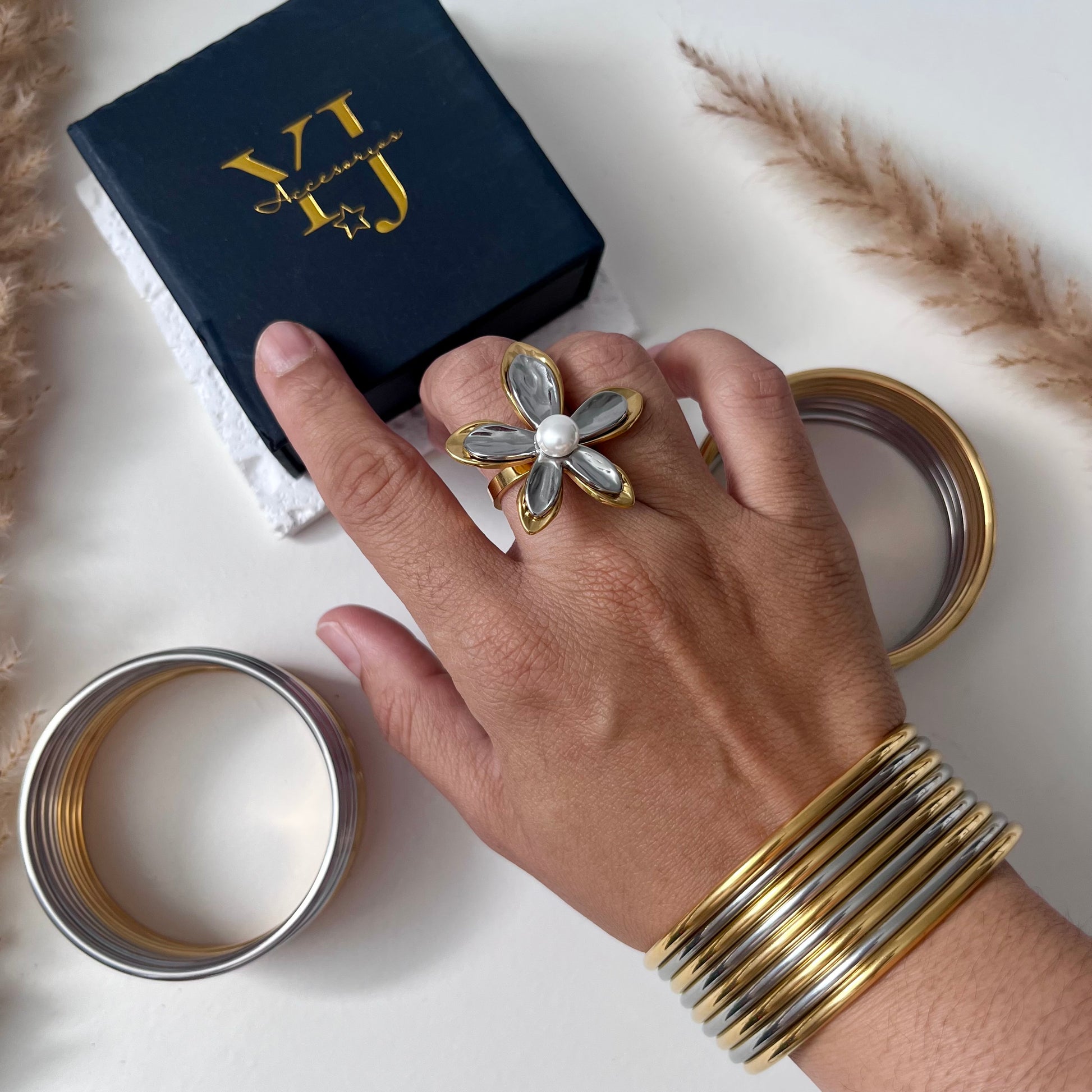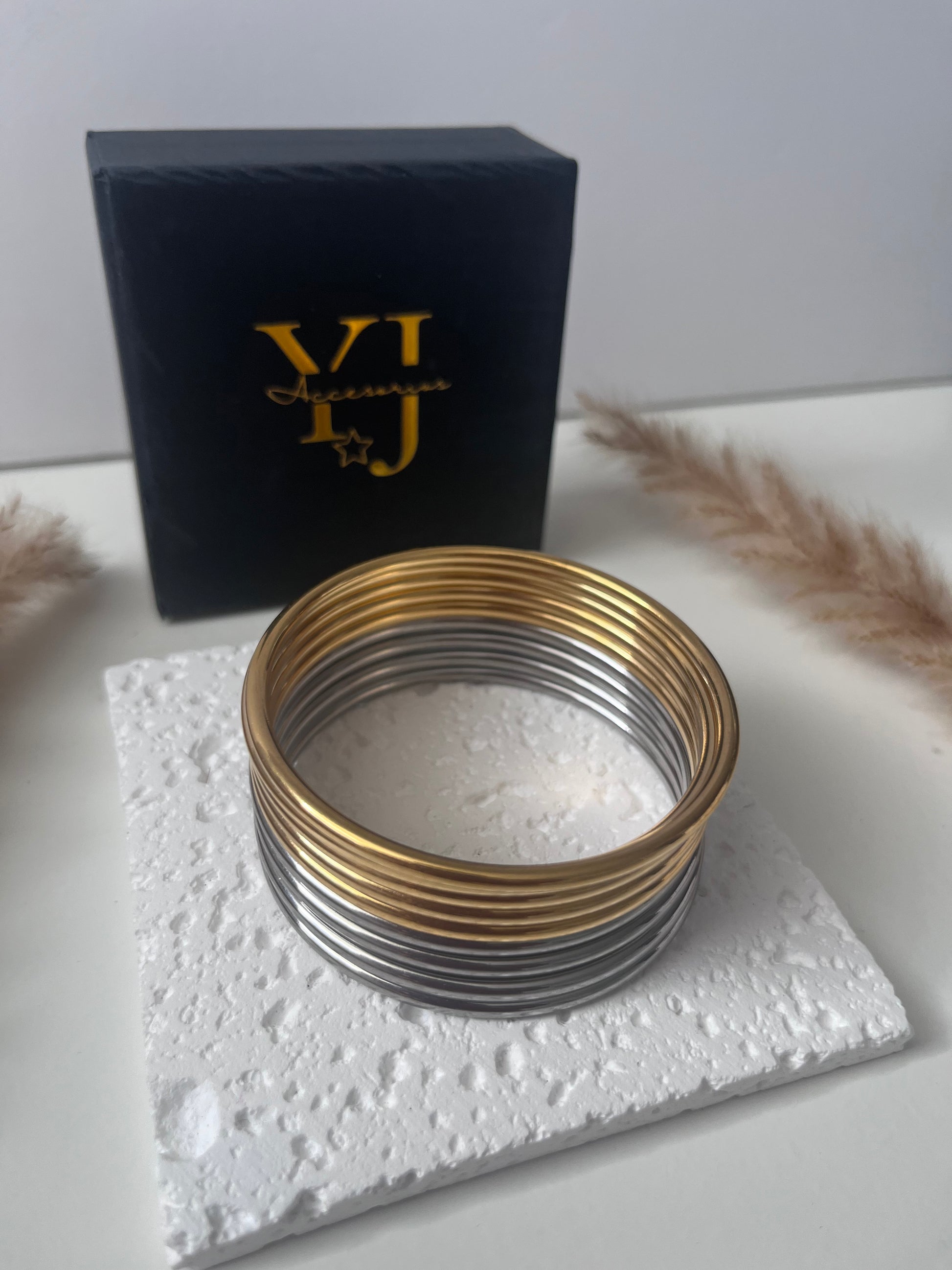 Cada set incluye 5 pulseras doradas y 4 plateadas, creando una combinación perfecta para cualquier ocasión — desde el uso diario hasta eventos especiales.