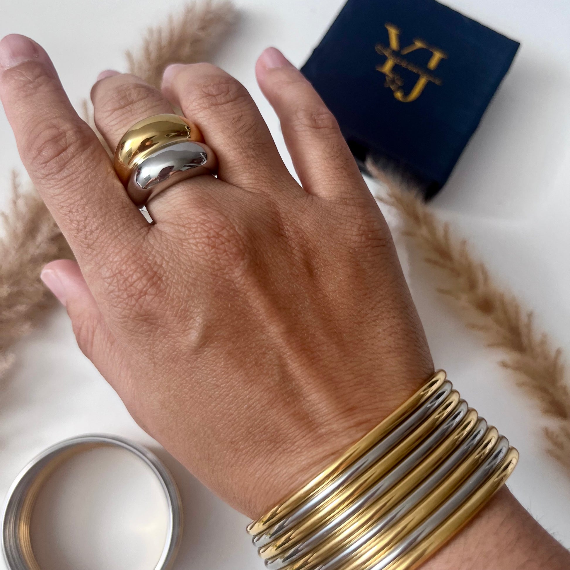 Añade un toque de elegancia atemporal con nuestro Set de Pulseras doble tono, un conjunto de 9 brazaletes minimalistas elaborados en acero inoxidable 304 con recubrimiento PVD en oro de 18K, resistentes al agua y al desgaste.