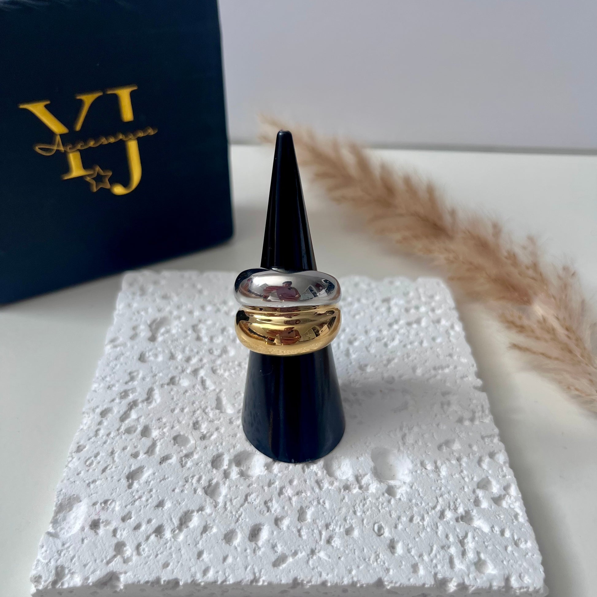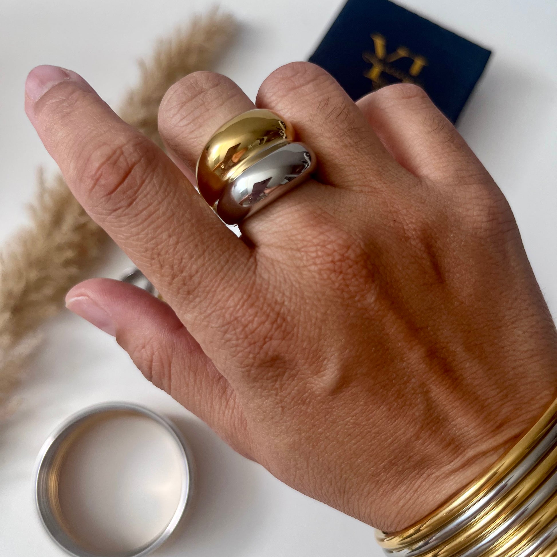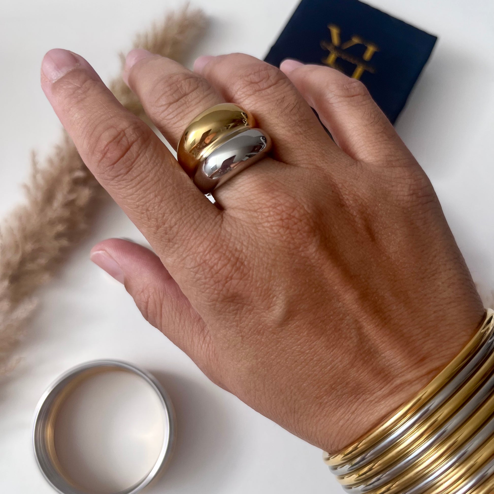 La Sortija Doble Tono es el equilibrio perfecto entre fuerza y elegancia. Su diseño bold combina el dorado de lujo con el plateado moderno, creando un contraste que resalta cualquier look.