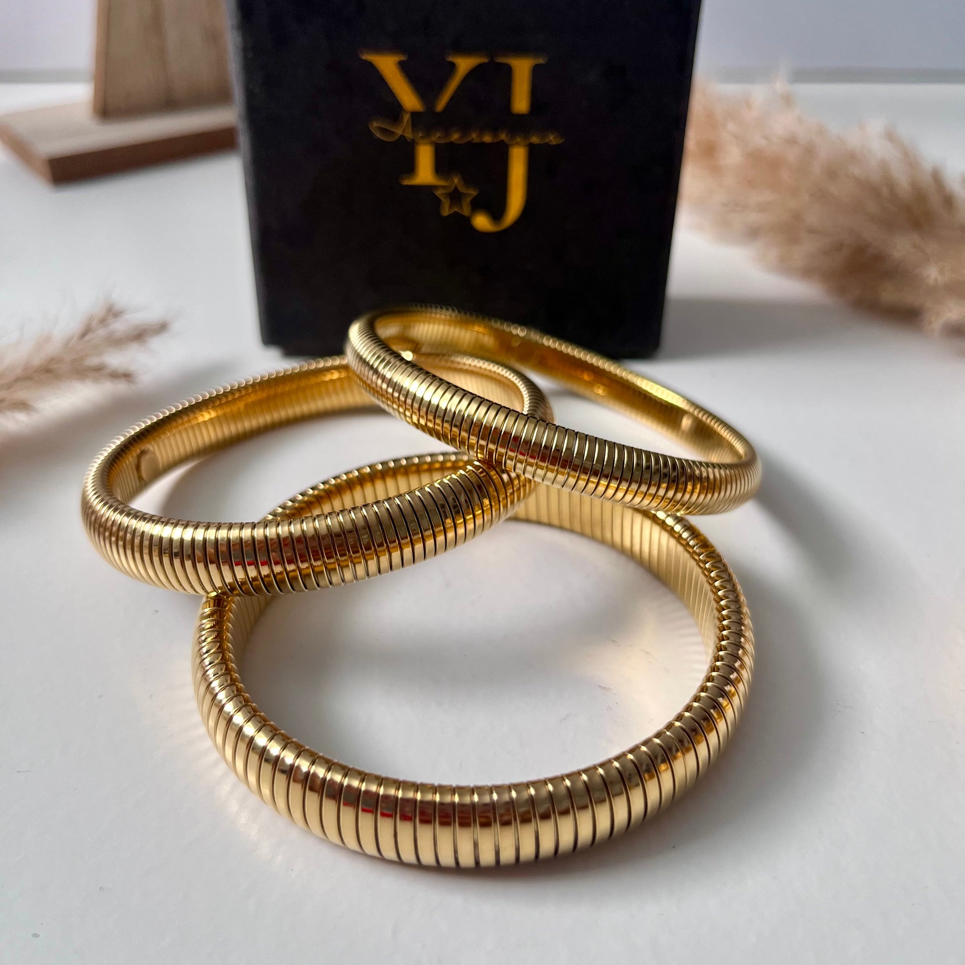 Cada set incluye tres pulseras de diferentes grosores (12 mm, 10 mm y 8 mm), diseñadas para lograr un look apilado moderno, llamativo y elegante.